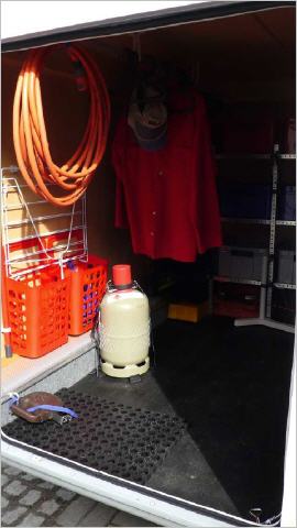 Und die 5 kg-Gasflasche hat nun ihren Platz hinten in der Heckgarage. Acht Schrauben in den Boden, fertig. Auch davon mache ich mal ein Foto.