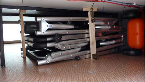 Unsere neuen Liegen haben im Doppelboden ihren Platz gefunden, zusammengefaltet und übereinander gelagert. Damit die sich während der Fahrt nicht selbstständig machen und verrutschen, habe ich an drei Seiten Pfosten platziert, die sich wegklappen lassen. Schwer zu beschreiben, aber ich mache mal ein Bild davon.