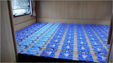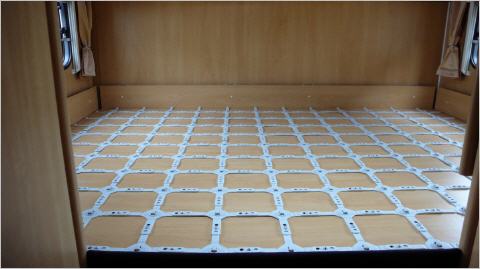 Manche froli-Besitzer haben die alten Lattenroste rausgerissen, andere haben sie drin gelassen und sich zusätzlich ein Auflagengitter aus Kunststoff zugelegt, allerdings dann mit dem Nachteil, dass man weitere ca. 5 cm in der Höhe verliert. Wir haben uns entschlossen, die alten Lattenroste zu entfernen. Was wir noch klären müssen, ist, ob die vorhandene Bett-Bodenplatte=Decke der Heckgarage stabil genug ist, um direkt darauf das froli-Bettsystem zu platzieren und die Matratzen aufzulegen. Ansonsten müssen wir noch eine stabile Platte einziehen.