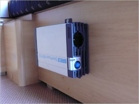 Es ist der Waeco MSP352 geworden mit 350 Watt Dauerleistung bzw. 700 Watt Spitzenleistung, bei völkner für knapp unter 200 Euro zu haben. Die Leistung sollte reichen, um damit ein Laptop zu laden, ein Handy oder den Akku von der Kamera, denn dafür haben wir ihn gekauft. Angebracht habe ich den Wechselrichter unter dem Tisch an der Sitzbank entgegengesetzt der Fahrrichtung, weil von hier aus der Weg zur Bordbatterie am kürzesten ist. Zwei kleine Löcher gebohrt für die Kabel, und die Kabel in einem Stück Kabelkanal verlegt, schon war der Fall erledigt. Hier ein Bild davon: